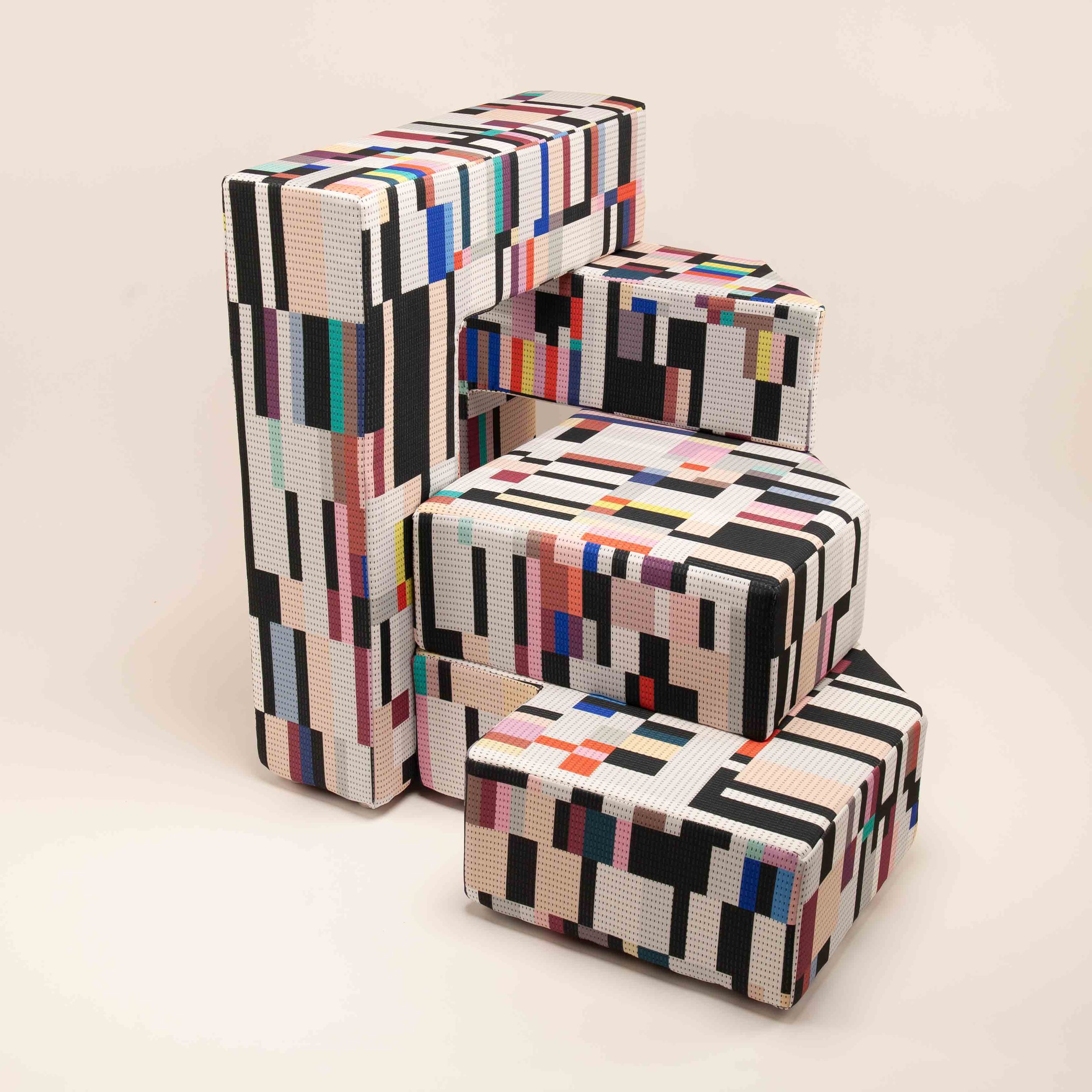 The idea for the Brayton Chair came from reclining on a staircase where the steps provide a comfortable seat, an armrest, and a footrest. Prototyping started with sketches and small wooden blocks, progressed to a cardboard model, and then to a 3D print. The chair was then modelled in Rhino and plans were made for construction of the various components. Construction began with a wooden base followed by layered foam and finally, a muslin cover. Final upholstery was completed with a LEED certified, fully recycled content polyester fabric - Pixel Color Bar designed by Jenny Mcgee Dougherty for Designtex.