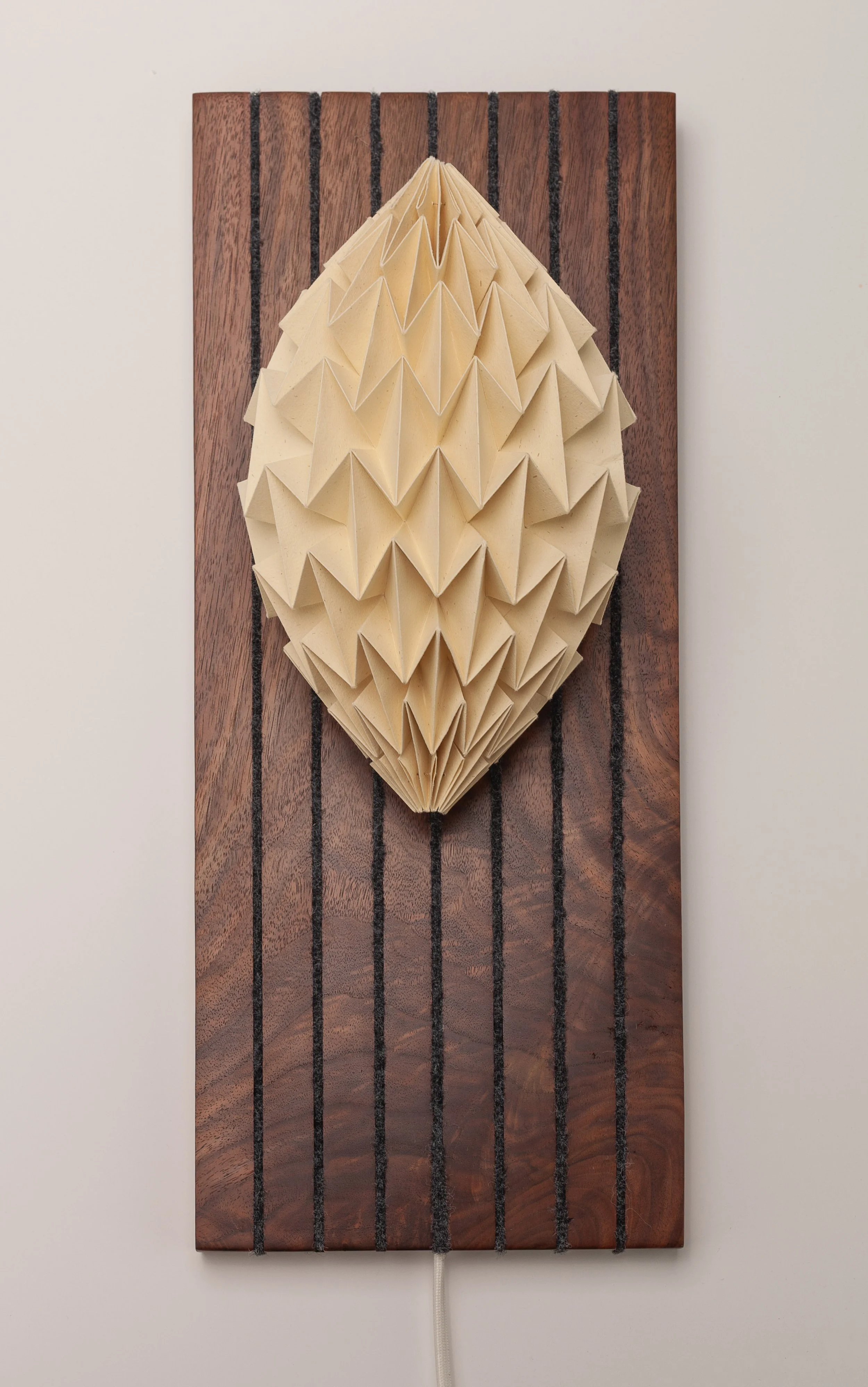 The Facet Wall Light transforms folded geometry into illumination. The sculpted paper form, built from repeating triangular facets, attaches to the grooved wooden panel via a hand formed copper fixture. When lit, it creates a dynamic interplay of rhythm, shadow, and material contrast. The piece reflects research into repetition and process-driven form, turning the logic of folding into a luminous, architectural presence. Both sculptural and functional, the Facet Wall Light brings warmth, structure, and quiet complexity to any space.