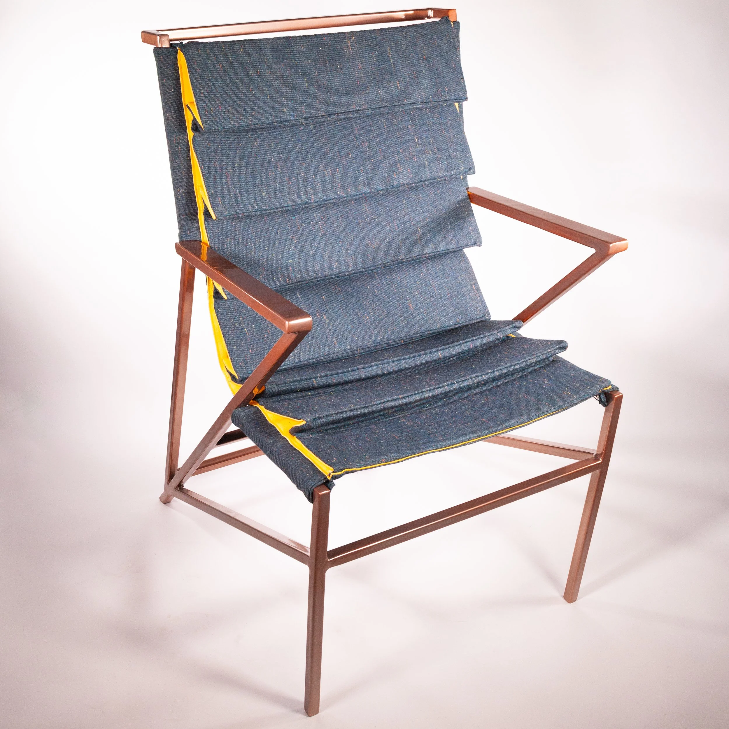 The Cascade Chair is constructed from a welded steel frame with a fabric sling seat. Its original concept evolved from the duo of Pleat & Tuck and the paper folding techniques of Paul Jackson. Steel is the primary material with fabric as a secondary, however, the secondary material is the focus of the chair with cascading pleats adorning the sling seat.