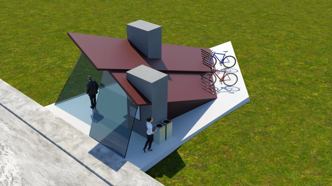 Using 3dsMax, a bus stop was designed for the property adjacent to Art Building West on the University of Iowa campus. The goal of the design was both functional and aesthetic, intended to compliment the unique architecture of the Stephen Holl designed building. Photographs of Art Building West were used to add realism to the renders and give a sense of the bus stops location on campus.